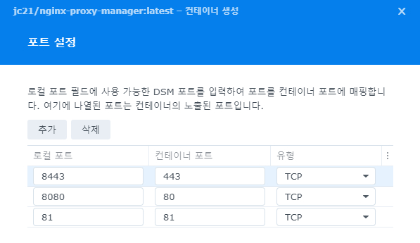 그런데 NAS도 기본포트로 80 / 443 을 사용하기 때문에 다른 포트로 매핑(연결)시켜주어야 한다.