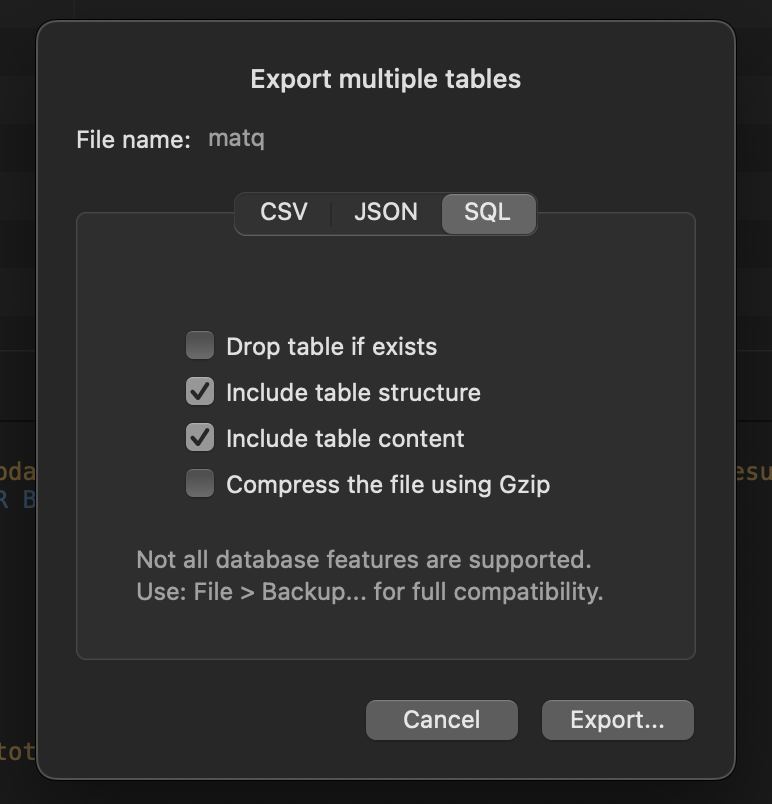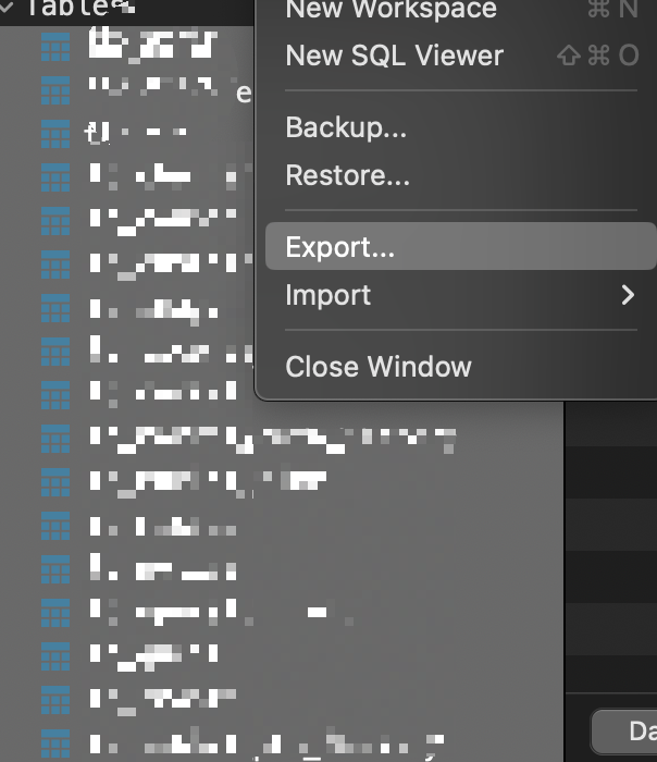 테이블을 모두 선택 후 Exprot (내보내기) 한다.