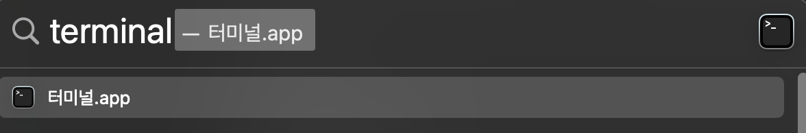command⌘ + 스페이스바를 누르면 나오는 Spotlight 검색에 터미널 / terminal 을 입력해서 엔터를 눌러 실행시킨다.
