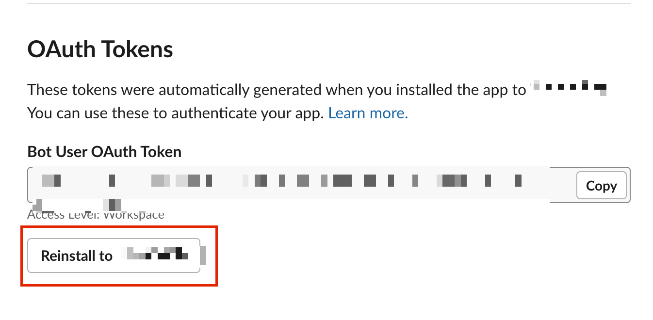 OAuth & Permissions 탭으로 돌아와서 -> OAuth Tokens 에 있는