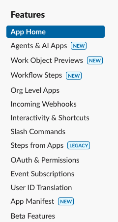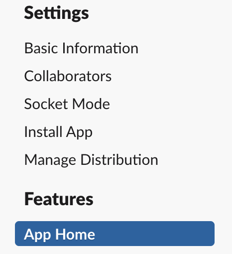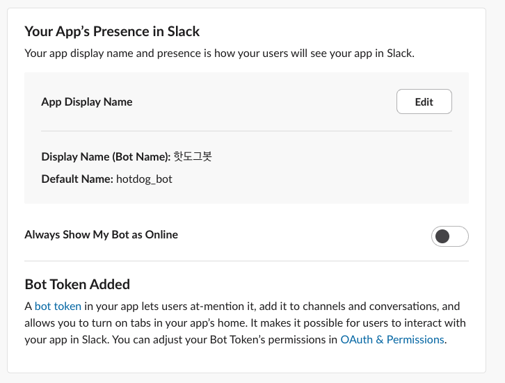 App Home -> 아래로 내려보면 아래의 탭을 볼 수 있다. 버튼 체크를 해주자