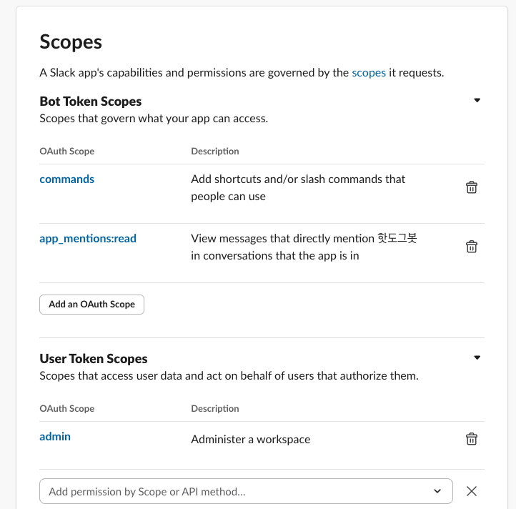 OAuth & Permissions -> Scope 를 지정 해주어야 한다.