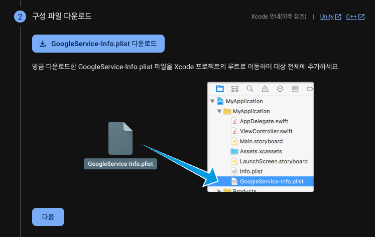 GoogleService-info.plist 구성파일을 받은 후 안내와 같이 Xcode 루트 디렉토리에 넣어준다.
