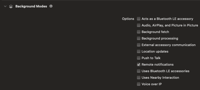 Capability 에 들어가서 Push Notifications, Background Modes 를 추가 해준다.