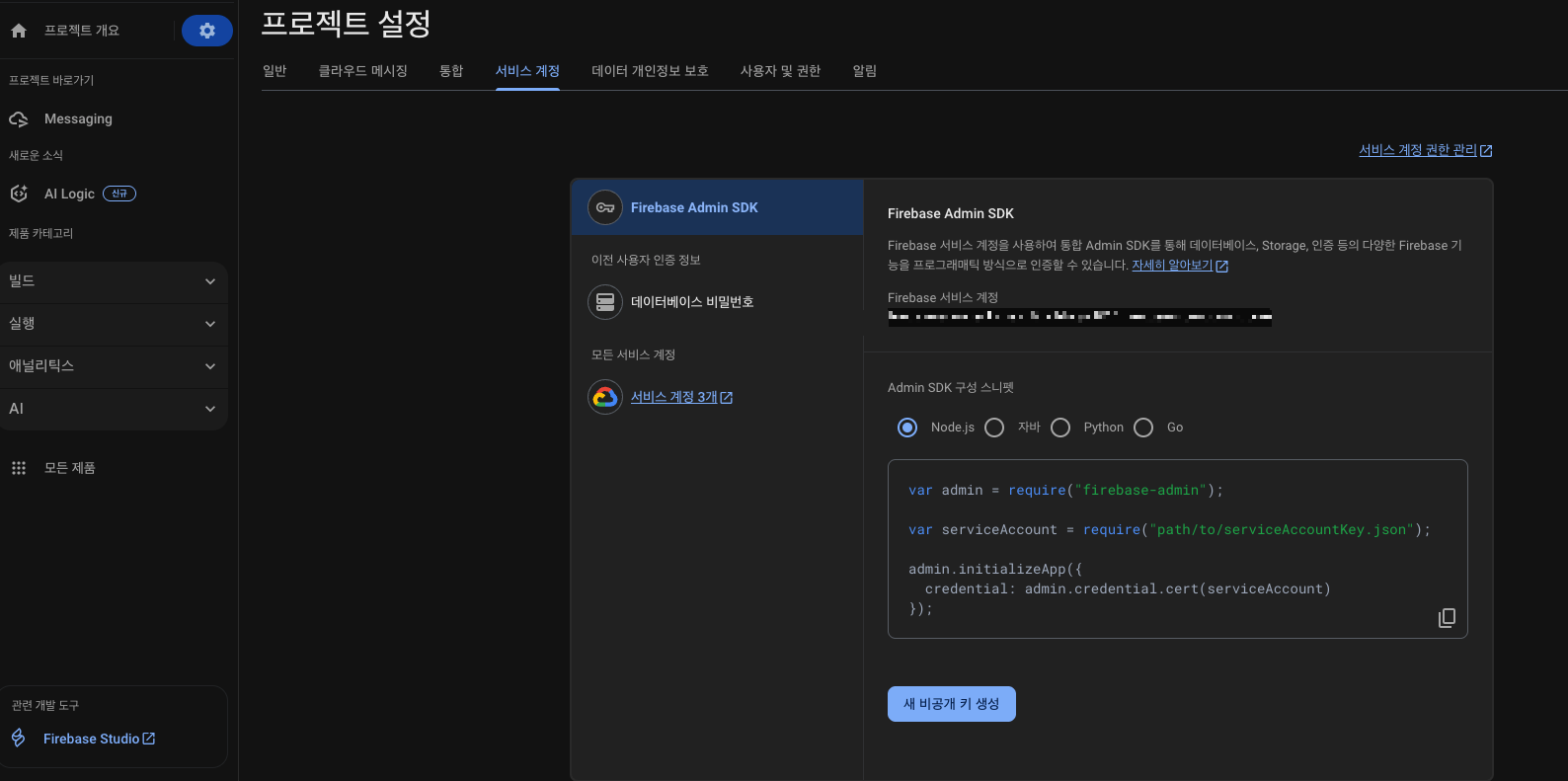 프로젝트 설정 > 서비스 계정 > 새 비공개키 생성