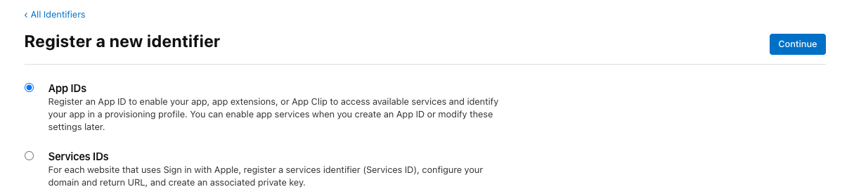 필자는 앱 환경이기 때문에 App IDs 를 만든다.