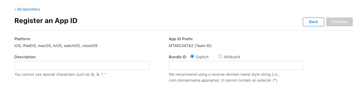 보통 패키지 명(com.exam.myapp)을 사용 하는데, Services ID 와 App ID 를 구분짓기 위해,
